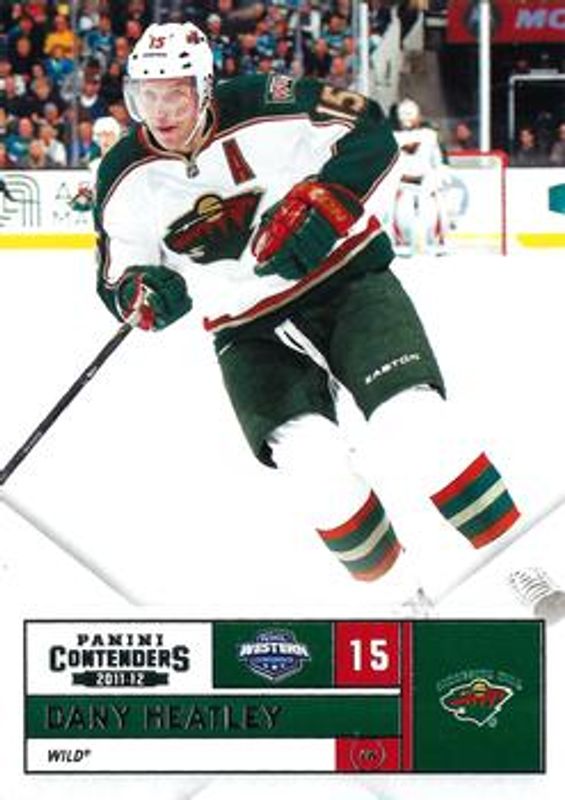 The Dany Heatley 2011 Contenders #15 Base /800 card is 1 of 7 Dany Heatley's card variations in the 2011 Contenders set being tracked by Sports Card Investor, including Gold /100, Black /1, Printing Plate Black /1, Printing Plate Cyan /1, and Printing Plate Magenta /1.