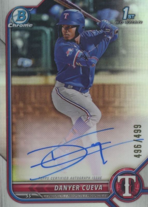 This card is 1 of 22 Danyer Cueva's card variations in the 2022 Bowman Chrome set being tracked by Sports Card Investor, including Prospect Auto (1st), Prospect Auto - Black & White Mini-Diamond Refractor (1st), Prospect Auto - Speckle Refractor /299 (1st), Prospect Auto - Purple Refractor /250 (1st), and Prospect Auto - Blue RayWave Refractor /150 (1st).