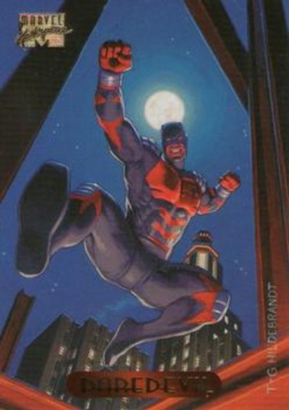 The Daredevil 1994 Fleer Marvel Masterpieces Hildebrandt Brothers #26 Base card is 1 of 5 Daredevil's card variations in the 1994 Fleer Marvel Masterpieces Hildebrandt Brothers set being tracked by Sports Card Investor, including Gold Foil Signatures, Bronze Holofoils, Gold Holofoils, and Silver Holofoils.