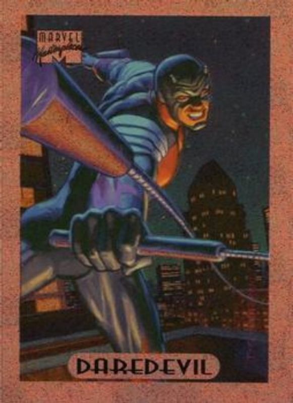 The Daredevil 1994 Fleer Marvel Masterpieces Hildebrandt Brothers #3 Bronze Holofoils card is 1 of 5 Daredevil's card variations in the 1994 Fleer Marvel Masterpieces Hildebrandt Brothers set being tracked by Sports Card Investor, including Base, Gold Foil Signatures, Gold Holofoils, and Silver Holofoils.