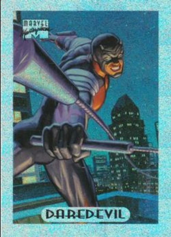 The Daredevil 1994 Fleer Marvel Masterpieces Hildebrandt Brothers #3 Silver Holofoils card is 1 of 5 Daredevil's card variations in the 1994 Fleer Marvel Masterpieces Hildebrandt Brothers set being tracked by Sports Card Investor, including Base, Gold Foil Signatures, Bronze Holofoils, and Gold Holofoils.