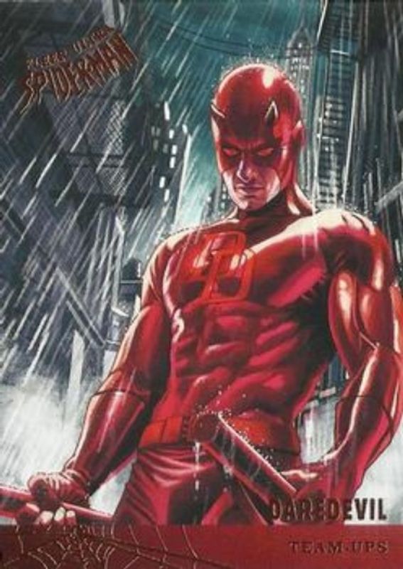 The Daredevil 2017 Fleer Ultra Spider-Man #TU1 Team Ups card is 1 of 36 Daredevil's card variations in the 2017 Fleer Ultra Spider-Man set being tracked by Sports Card Investor, including Base, Silver Web Foil, Gold Web Foil Autographs /49, Printing Plate Black /1, and Printing Plate Cyan /1.