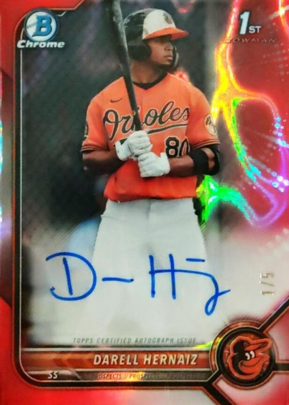 Auctions Ending Soon for Darell Hernaiz 2022 Bowman #CPA-DHZ Chrome Prospect Auto - Red Lava Refractor /5 (1st) RAW