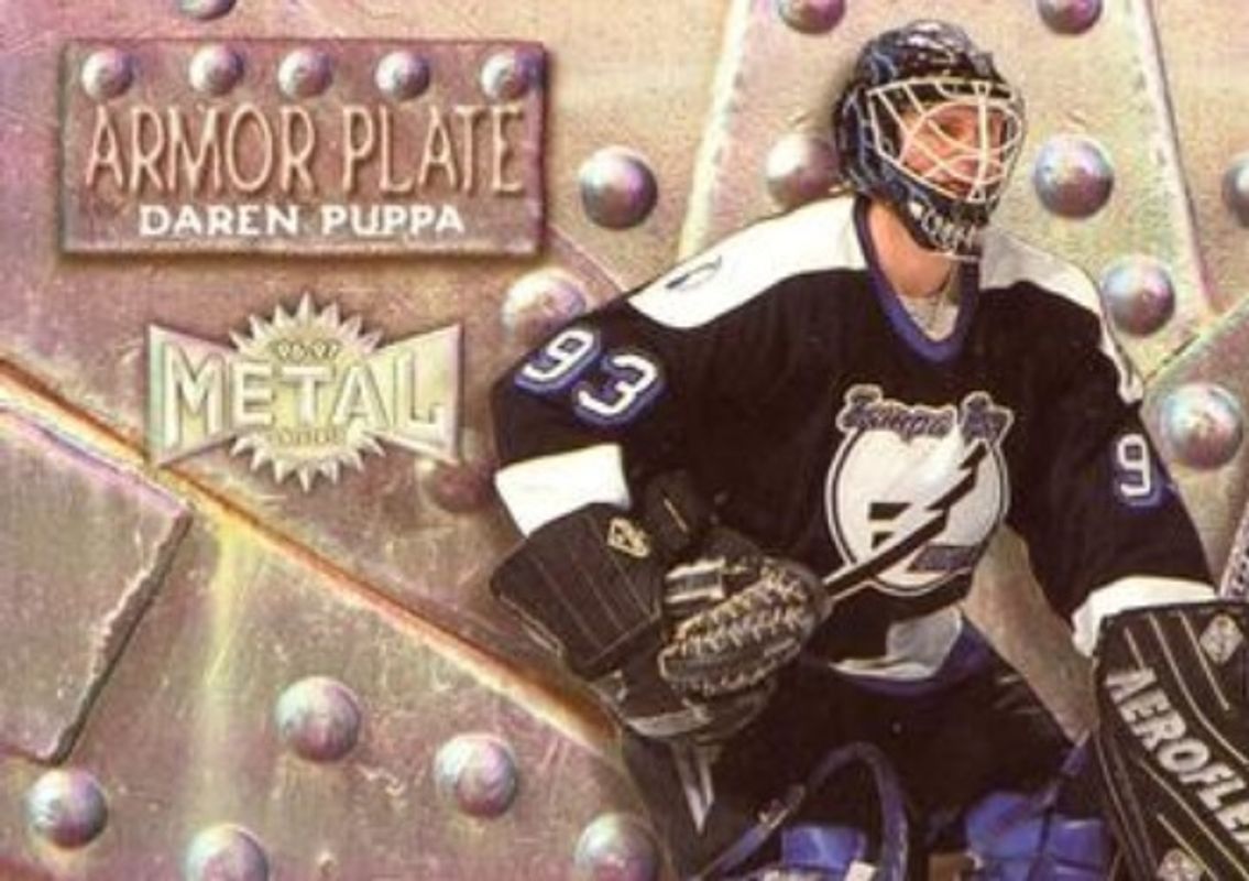 The Daren Puppa 1996 Fleer Metal Universe #8 Armor Plate - Super Power card is 1 of 3 Daren Puppa's card variations in the 1996 Fleer Metal Universe set being tracked by Sports Card Investor, including Base, and Armor Plate.