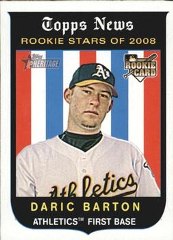 The Daric Barton 2008 Topps Heritage #117b Base Rookie card is 1 of 2 Daric Barton's card variations in the 2008 Topps Heritage set being tracked by Sports Card Investor, including Base.