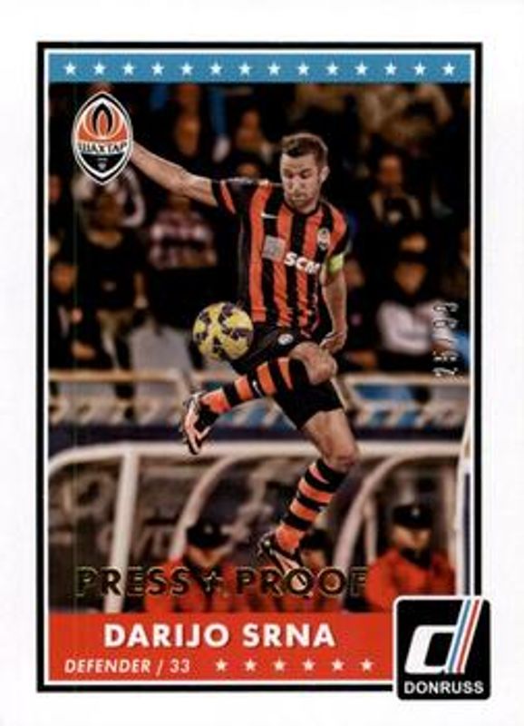 The Darijo Srna 2015 Donruss #21 Gold Press Proof /99 card is 1 of 16 Darijo Srna's card variations in the 2015 Donruss set being tracked by Sports Card Investor, including Base, Bronze Press Proof /299, Silver Press Proof /199, Red Soccer Ball /49, and Green Soccer Ball /25.