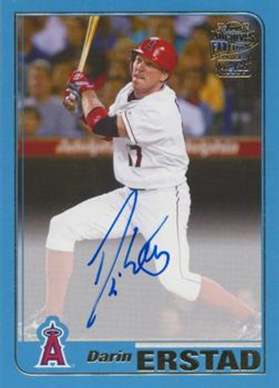 The Darin Erstad 2020 Topps Archives #FFA-DE Fan Favorites Autographs - Blue /25 card is 1 of 5 Darin Erstad's card variations in the 2020 Topps Archives set being tracked by Sports Card Investor, including Fan Favorites Autographs, Fan Favorites Autographs - Purple /150, Fan Favorites Autographs - Silver /99, and Fan Favorites Autographs - Gold Foil /1.