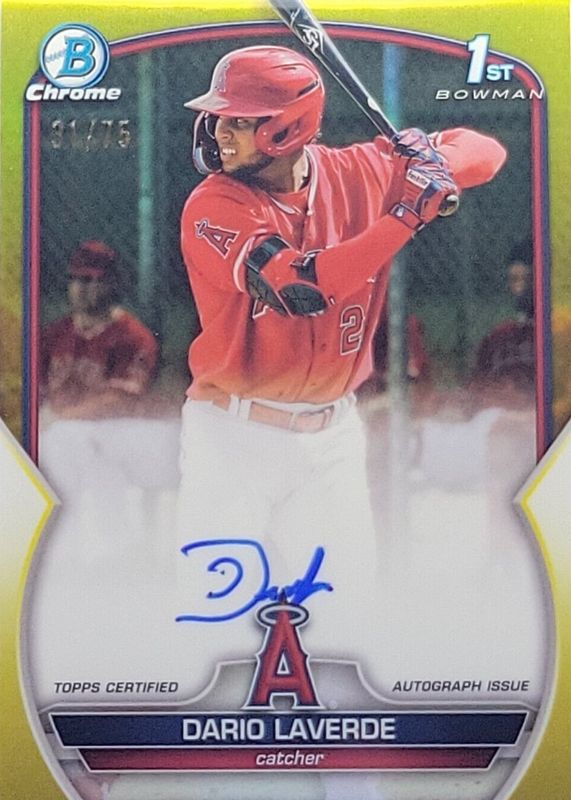 Best Prices Available For Sale of Dario Laverde 2023 Bowman Chrome #CPA-DL Prospect Auto - Yellow Refractor /75 (1st)