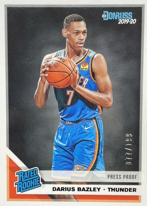 The Darius Bazley 2019 Donruss #249 Press Proof Purple /199 Rookie card in Raw condition has not changed in price in the last 30 days and was last sold for $6.25 .