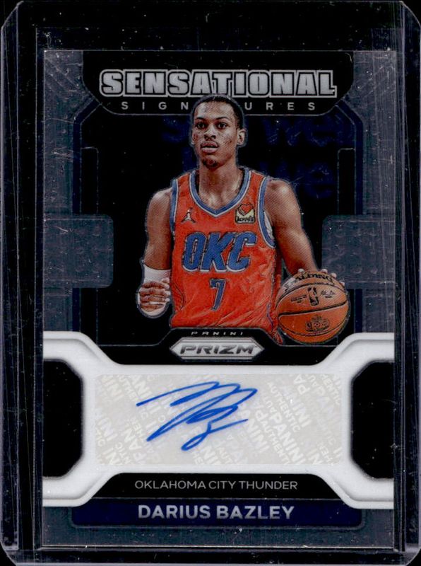The Darius Bazley 2021 Prizm #SS-DBZ Sensational Signatures card is 1 of 77 Darius Bazley's card variations in the 2021 Prizm set being tracked by Sports Card Investor, including Base, Blue NBA 75th Anniversary, Blue Wave, Choice Blue Yellow Green, and Factory Set Blue Hyper.