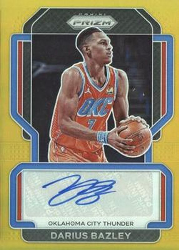 The Darius Bazley 2021 Prizm #SG-DBZ Signatures - Gold /10 card is 1 of 77 Darius Bazley's card variations in the 2021 Prizm set being tracked by Sports Card Investor, including Base, Blue NBA 75th Anniversary, Blue Wave, Choice Blue Yellow Green, and Factory Set Blue Hyper.