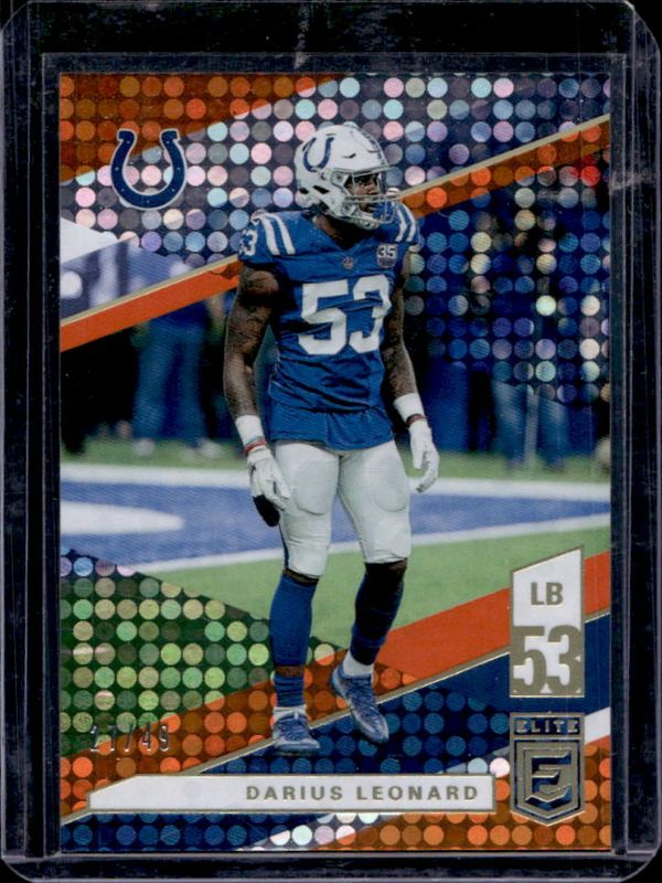 The Darius Leonard 2019 Elite #67 Orange /49 card is 1 of 13 Darius Leonard's card variations in the 2019 Elite set being tracked by Sports Card Investor, including Green, Red /299, Purple /99, Status /97, and Status Die-Cut /24.