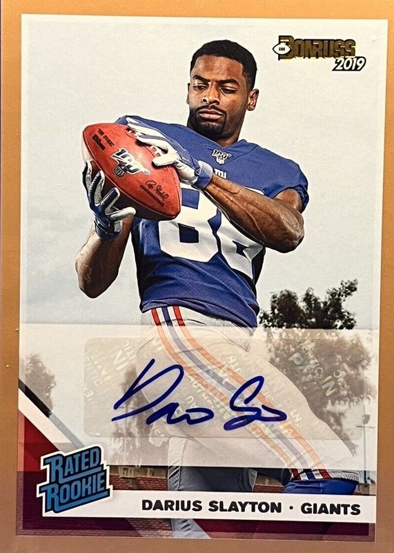The Darius Slayton 2019 Donruss #338 Rated Rookie Autographs - Bronze card in Raw condition has not changed in price in the last 30 days and was last sold for $5.50 .