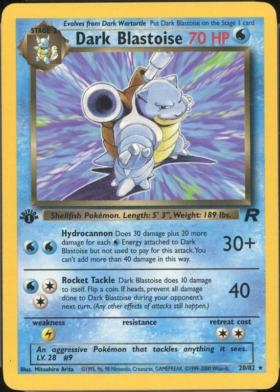 The Dark Blastoise 2000 Team Rocket #20/82 1st Edition card in Raw TCG (Near Mint) condition has moved down -$8.00 (-13.6%) in the last 30 days and was last sold for $51.00 .
