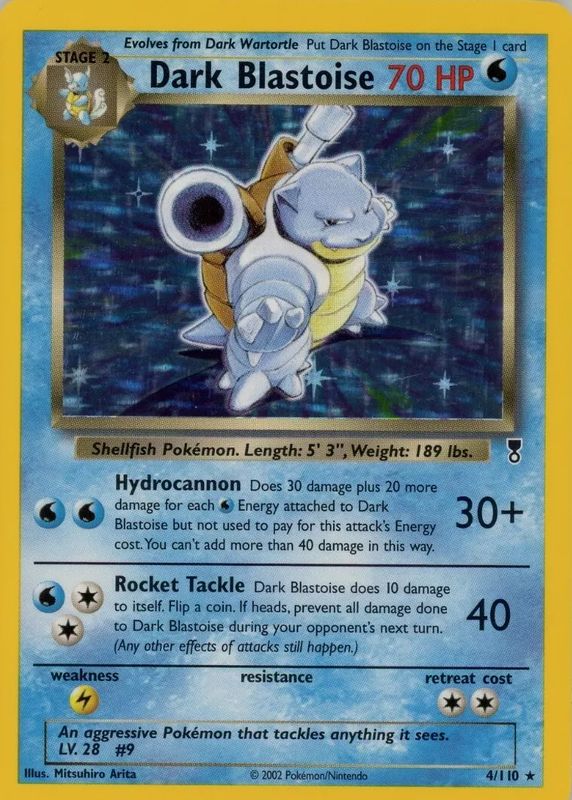 The Dark Blastoise 2002 Legendary Collection #4 Holo card in Raw TCG (Lightly Played) condition has moved up $15.01 (+37.5%) in the last 30 days and was last sold for $55.00 .