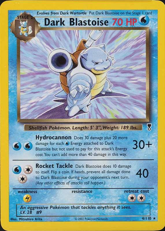 The Dark Blastoise 2002 Legendary Collection #4 Promo (Turmoil Theme Deck) card in Raw TCG (Lightly Played) condition has not changed in price in the last 30 days and was last sold for $17.99 .