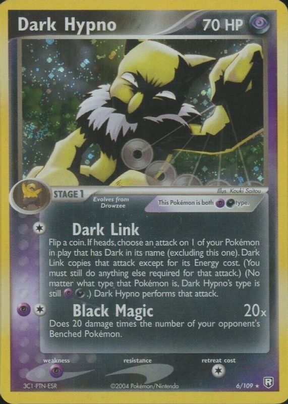The Dark Hypno 2004 EX: Team Rocket Returns #006/109 Holo card in Raw TCG (Near Mint) condition has not changed in price in the last 30 days and was last sold for $25.00 .