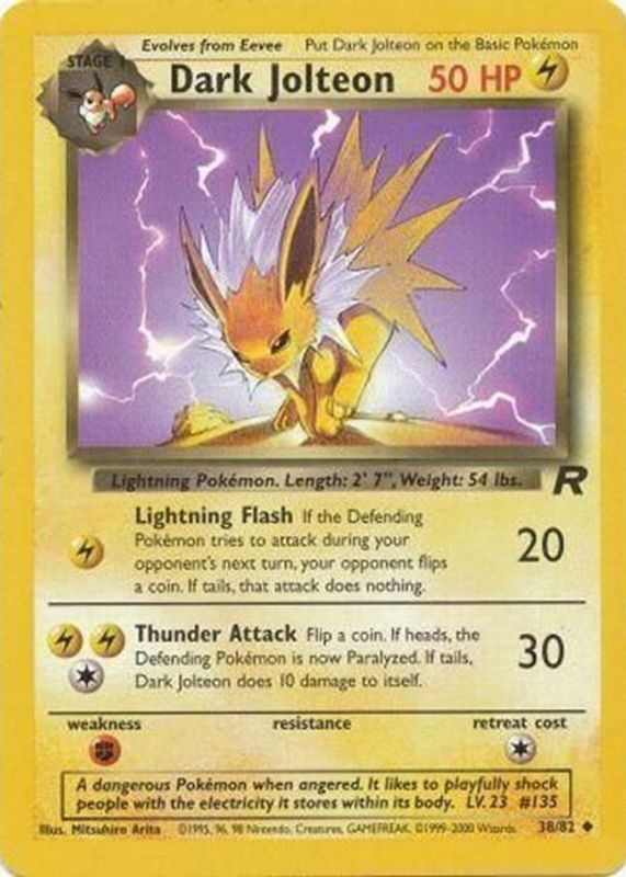 The Dark Jolteon 2000 Team Rocket #38/82 Unlimited card in Raw TCG (Near Mint) condition has moved up $5.29 (+69.6%) in the last 30 days and was last sold for $12.89 .