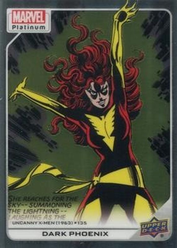 The Dark Phoenix 2023 Upper Deck Marvel Platinum #121 Base card is 1 of 30 Dark Phoenix's card variations in the 2023 Upper Deck Marvel Platinum set being tracked by Sports Card Investor, including Black Rainbow, Blue Rainbow, Blue Surge, Purple Rainbow, and Rainbow.