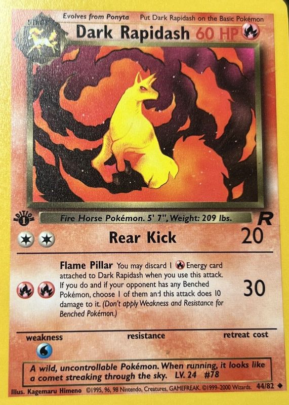 The Dark Rapidash 2000 Team Rocket #44/82 1st Edition card in Raw TCG (Near Mint) condition has moved down -$2.03 (-25.4%) in the last 30 days and was last sold for $5.97 .