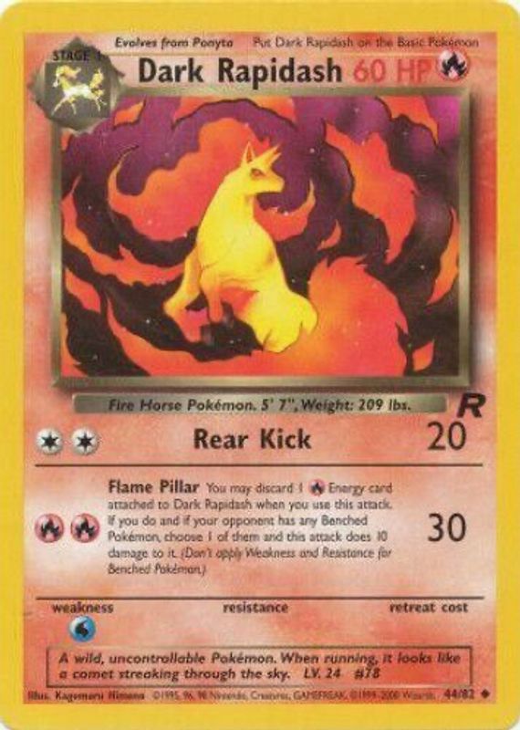 The Dark Rapidash 2000 Team Rocket #44/82 Unlimited card in Raw TCG (Near Mint) condition has moved down -$3.00 (-42.9%) in the last 30 days and was last sold for $3.99 .