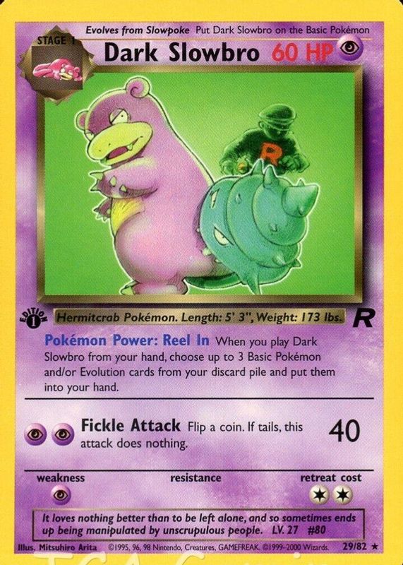 The Dark Slowbro 2000 Team Rocket #29/82 1st Edition card in Raw TCG (Near Mint) condition has moved up $0.50 (+2.9%) in the last 30 days and was last sold for $17.50 .