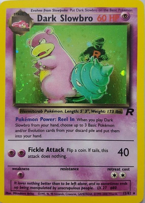 The Dark Slowbro 2000 Team Rocket #29/82 Unlimited card in Raw TCG (Near Mint) condition has moved up $9.78 (+85.8%) in the last 30 days and was last sold for $21.18 .