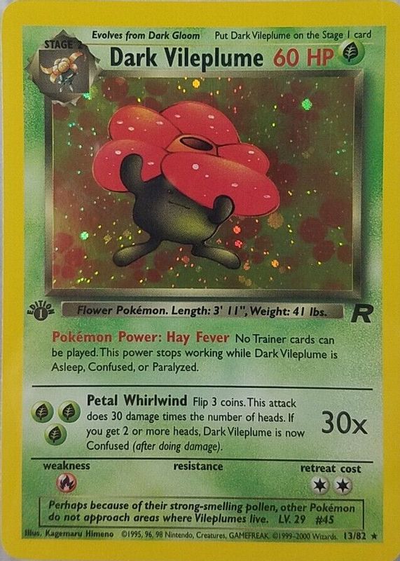 The Dark Vileplume 2000 Team Rocket #13/82 1st Edition Holo card in Raw TCG (Near Mint) condition has moved up $4.00 (+8.0%) in the last 30 days and was last sold for $54.00 .