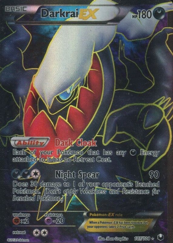 The Darkrai ex 2012 Black & White: Dark Explorers #107/108 Holo (Full Art) card in Raw TCG (Near Mint) condition has not changed in price in the last 30 days and was last sold for $465.51 .