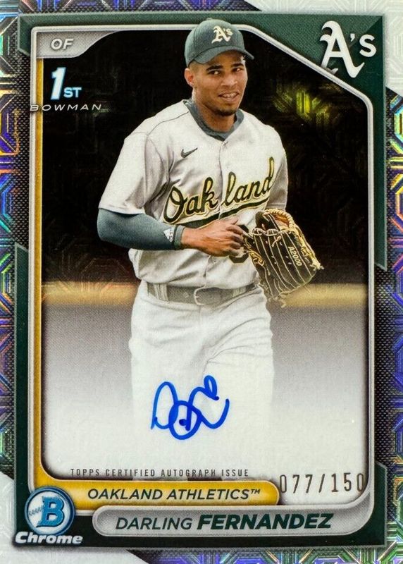 This card is 1 of 25 Darling Fernandez's card variations in the 2024 Bowman Chrome set being tracked by Sports Card Investor, including Prospect Auto (1st), Prospect Auto - Refractor /499 (1st), Prospect Auto - Speckle Refractor /299 (1st), Prospect Auto - Purple Refractor /250 (1st), and Prospect Auto - Blue RayWave Refractor /150 (1st).