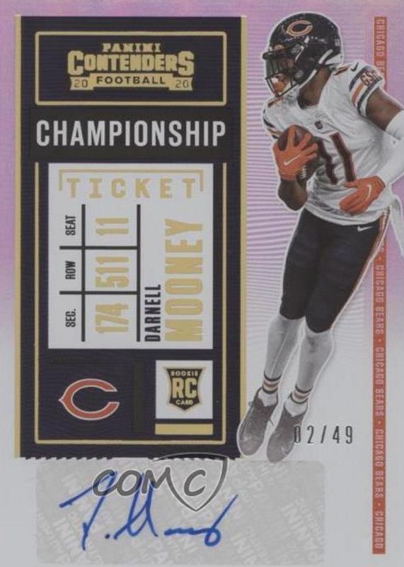 The Darnell Mooney 2020 Contenders #204 Rookie Ticket Auto - Championship Ticket /49 card in Raw condition has not changed in price in the last 30 days and was last sold for $15.50 .