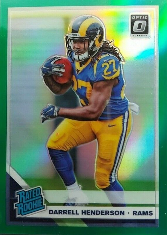 The Darrell Henderson 2019 Optic #160 Green /5 Rookie card in Raw condition has not changed in price in the last 30 days and was last sold for $49.99 .