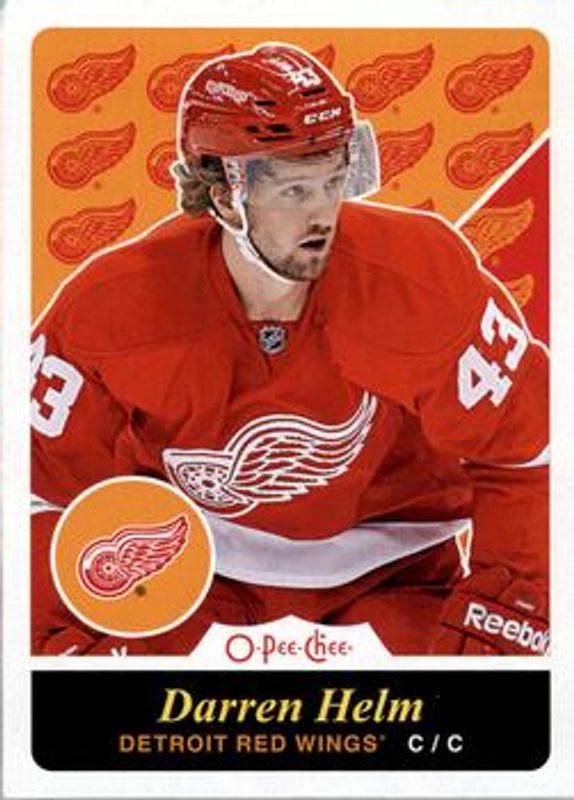The Darren Helm 2015 O-Pee-Chee Retro Blank Backs card is 1 of 6 Darren Helm's card variations in the 2015 O-Pee-Chee set being tracked by Sports Card Investor, including Base, Rainbow, Red, Retro, and Rainbow Black /100.