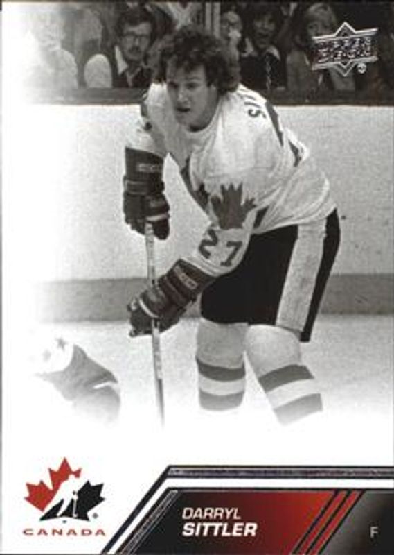 The Darryl Sittler 2013 Upper Deck Team Canada #115 Base card is 1 of 10 Darryl Sittler's card variations in the 2013 Upper Deck Team Canada set being tracked by Sports Card Investor, including Gold Signatures, Exclusive Red /100, High Gloss Gold /10, Black Signatures /5, and Printing Plates Black /1.