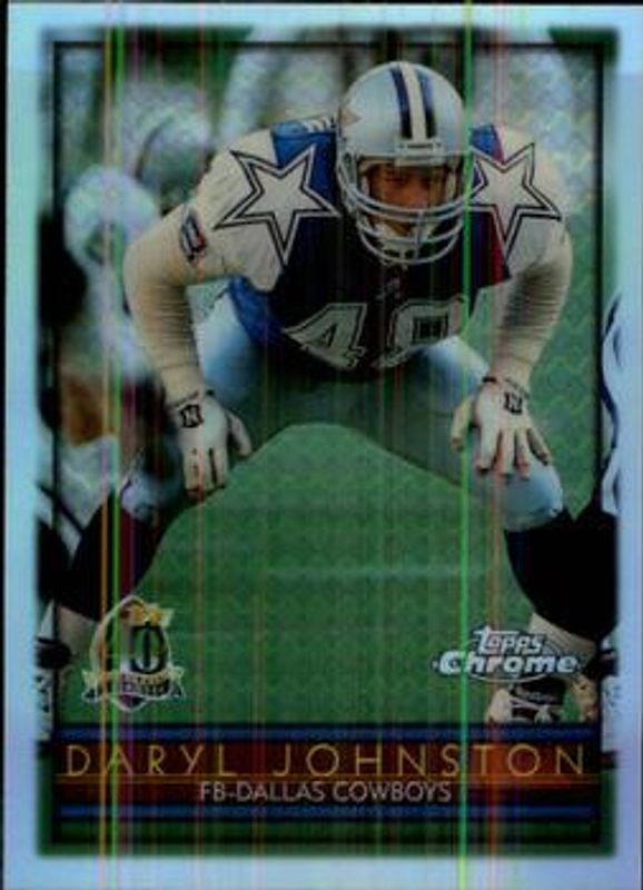 The Daryl Johnston 1996 Topps Chrome #121 Refractor card is 1 of 2 Daryl Johnston's card variations in the 1996 Topps Chrome set being tracked by Sports Card Investor, including Base.