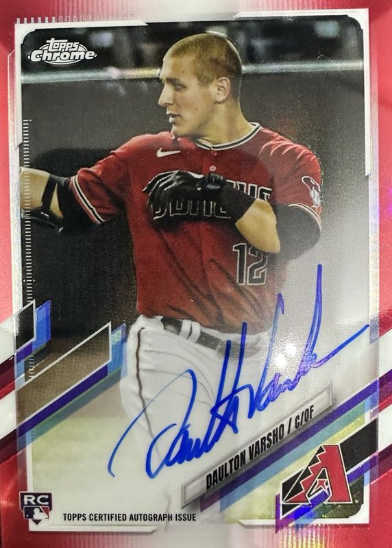 This card is 1 of 15 Daulton Varsho's card variations in the 2021 Topps Chrome set being tracked by Sports Card Investor, including Gold Refractor /50, Rookie Auto, Rookie Auto - Refractor /499, Rookie Auto - Purple Refractor /299, and Rookie Auto - Aqua Refractor /199.