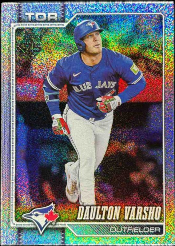 The Daulton Varsho 2026 Topps #2 Sandglitter card is 1 of 64 Daulton Varsho's card variations in the 2026 Topps set being tracked by Sports Card Investor, including Base, Aqua Holo Foil, Aqua Rainbow Foil, Diamante Foil, and Holo Foil.