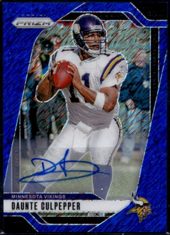 The Daunte Culpepper 2024 Prizm #193 Base Autographs - Blue Shimmer /25 card is 1 of 84 Daunte Culpepper's card variations in the 2024 Prizm set being tracked by Sports Card Investor, including Base, Choice Blue Yellow Green, Choice Silver, Disco, and Green.