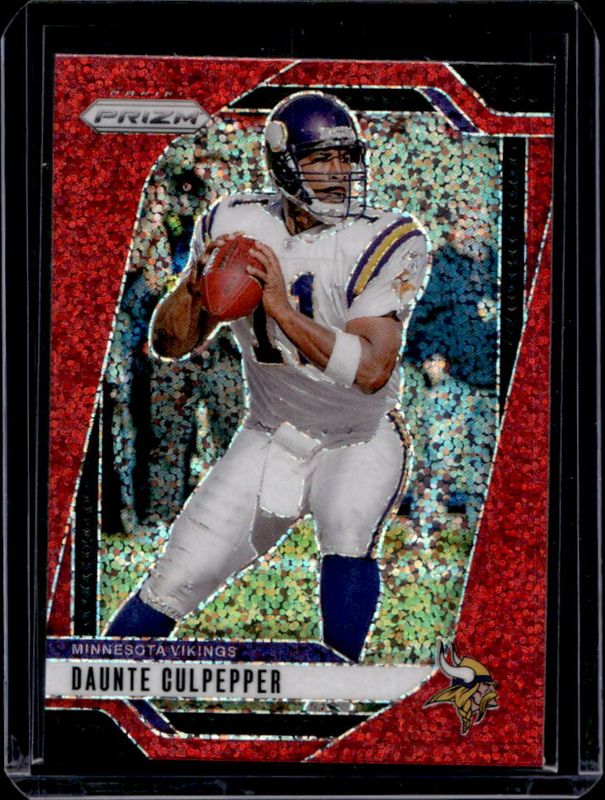The Daunte Culpepper 2024 Prizm #193 Red Sparkle /(SSP) card is 1 of 84 Daunte Culpepper's card variations in the 2024 Prizm set being tracked by Sports Card Investor, including Base, Choice Blue Yellow Green, Choice Silver, Disco, and Green.