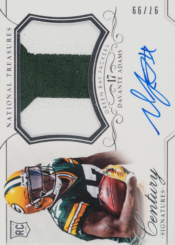 This card is 1 of 9 Davante Adams' card variations in the 2014 National Treasures set being tracked by Sports Card Investor, including Rookie Patch Auto - Numbers (/17), Rookie Patch Auto - Silver /25, Rookie Patch Auto - Gold /10, Rookie Patch Auto - Black /5, and Rookie Patch Auto - Blue /1.