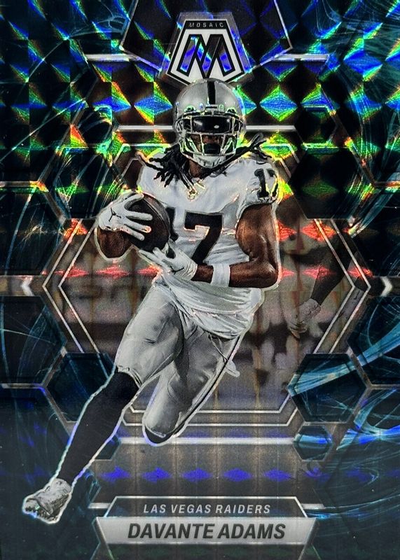 This card is 1 of 14 Davante Adams' card variations in the 2023 Mosaic set being tracked by Sports Card Investor, including Choice Peacock /(SSP), Honeycomb /(SSP), Red Sparkle /(SSP), White Sparkle /(SSP), and Green Fluorescent /10.