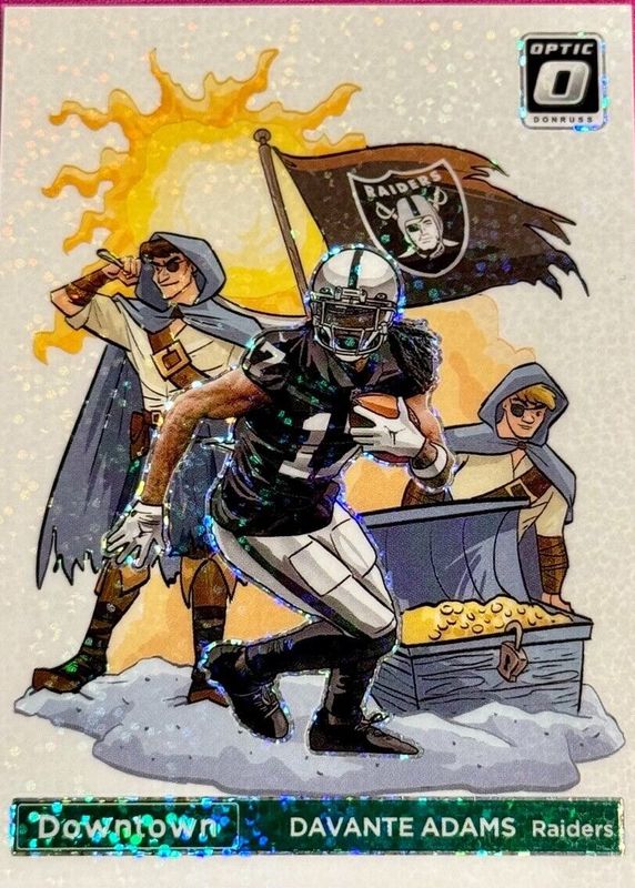 This card is 1 of 10 Davante Adams' card variations in the 2023 Optic set being tracked by Sports Card Investor, including Blazers /(SSP), Downtown /(SSP), Blazers - Black Pandora /25, Downtown - Black Pandora /25, and Blazers - Gold /10.