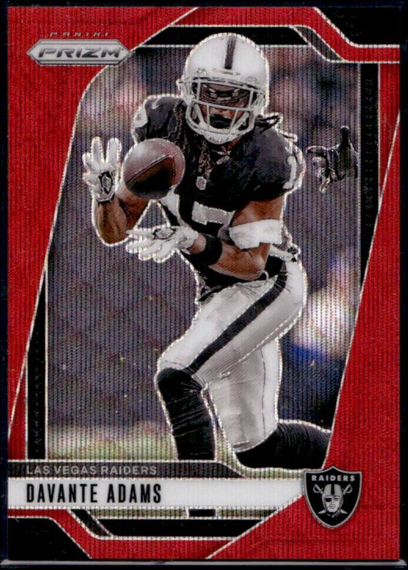 The Davante Adams 2024 Prizm #150 Red Wave /149 card is 1 of 84 Davante Adams' card variations in the 2024 Prizm set being tracked by Sports Card Investor, including Base, Choice Blue Yellow Green, Choice Silver, Disco, and Green.