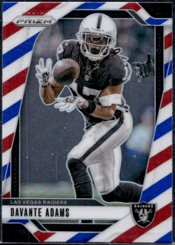 The Davante Adams 2024 Prizm #150 Red White Blue card is 1 of 84 Davante Adams' card variations in the 2024 Prizm set being tracked by Sports Card Investor, including Base, Choice Blue Yellow Green, Choice Silver, Disco, and Green.