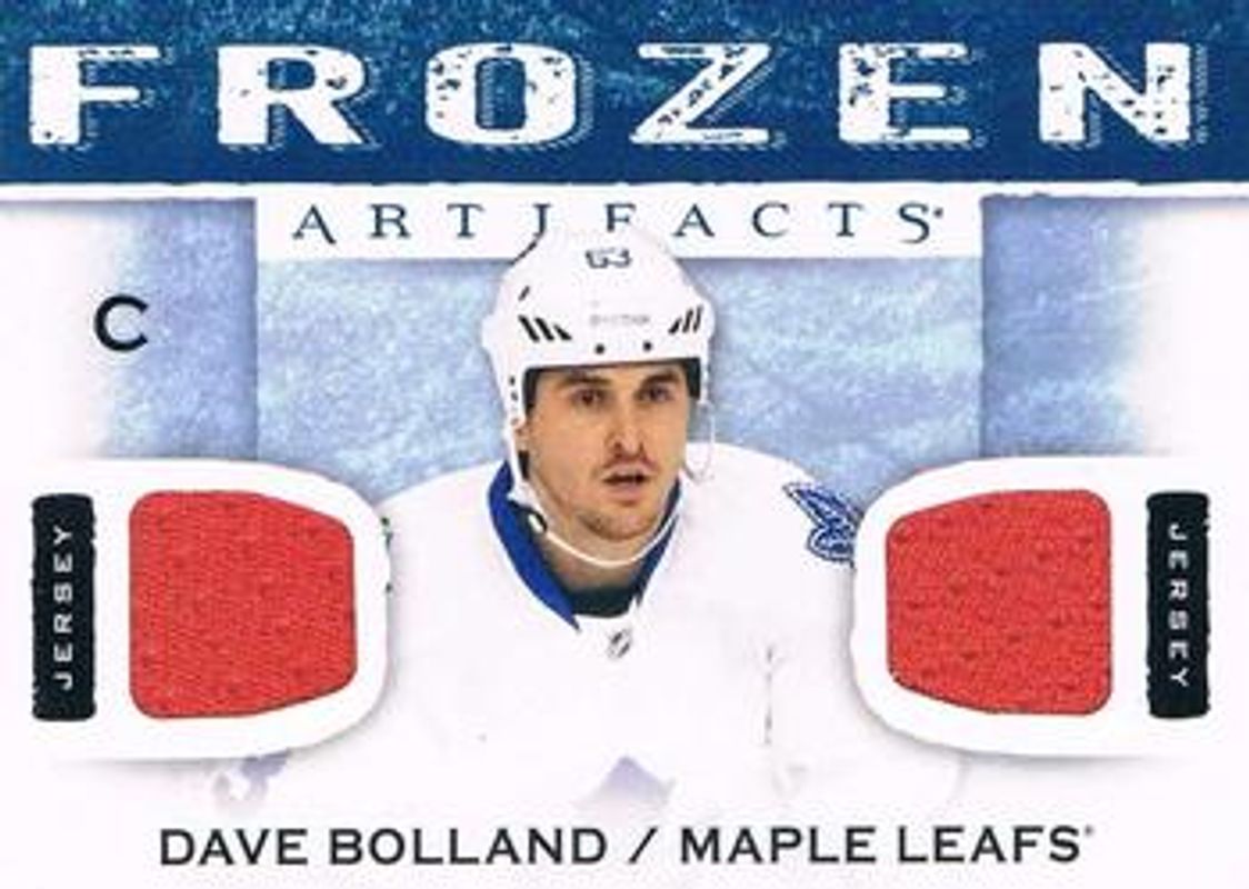 The Dave Bolland 2014 Upper Deck Artifacts #FA-DB Frozen Artifacts Jerseys - Blue card is 1 of 3 Dave Bolland's card variations in the 2014 Upper Deck Artifacts set being tracked by Sports Card Investor, including Frozen Artifacts Jerseys Patches - Emerald /36, and Frozen Artifacts Stick Tapes - Red /12.