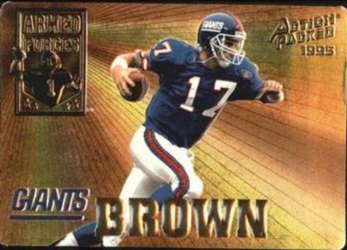 The Dave Brown 1995 Action Packed Flagship #AF7 Armed Forces card is 1 of 4 Dave Brown's card variations in the 1995 Action Packed Flagship set being tracked by Sports Card Investor, including Base, Quick Silver, and Armed Forces Braille.