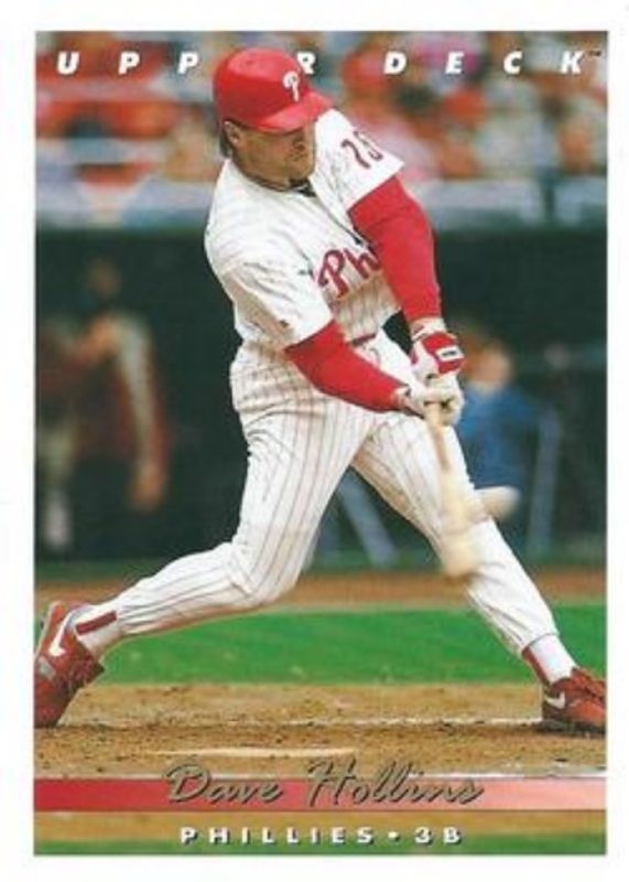 The Dave Hollins 1993 Upper Deck #153 Base card is 1 of 5 Dave Hollins' card variations in the 1993 Upper Deck set being tracked by Sports Card Investor, including #458 Base, #153 Gold Hologram, #458 Gold Hologram, and #HR10 Home Run Heroes.