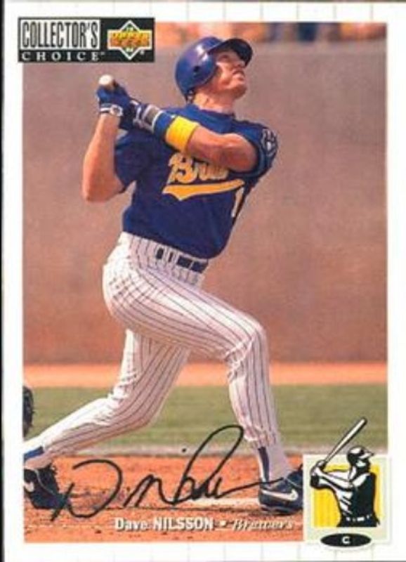 The Dave Nilsson 1994 Upper Deck Collector's Choice #216 Silver Signatures card is 1 of 3 Dave Nilsson's card variations in the 1994 Upper Deck Collector's Choice set being tracked by Sports Card Investor, including Base, and Gold Signatures.
