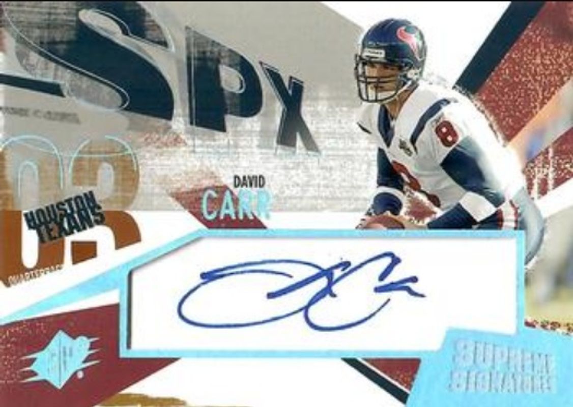 The David Carr 2003 SPx #SS-DC Supreme Signatures card is 1 of 11 David Carr's card variations in the 2003 SPx set being tracked by Sports Card Investor, including #78 Base /1100, #100 Base /1100, #100 Spectrum /25, #78 Spectrum /25, and #NFL-DC Winning Materials /350.