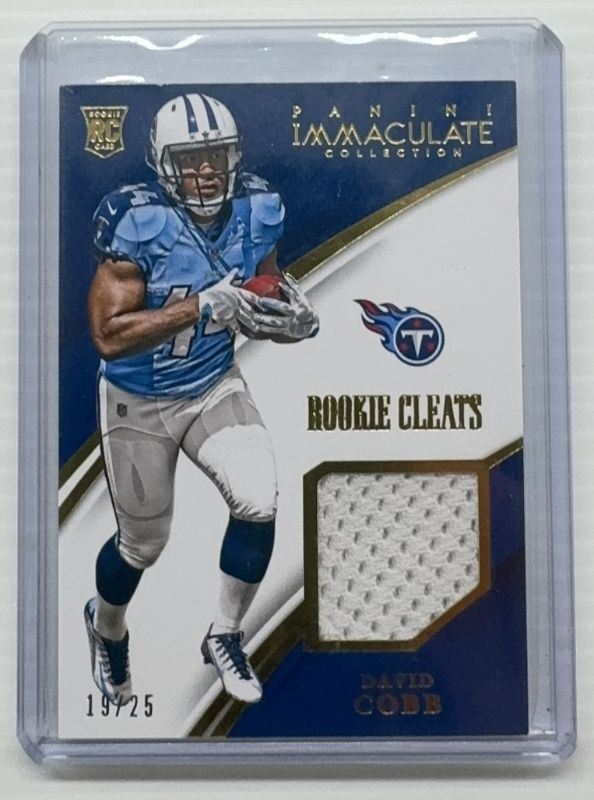 The David Cobb 2015 Immaculate #IRC-DC Rookie Cleats /18 card is 1 of 17 David Cobb's card variations in the 2015 Immaculate set being tracked by Sports Card Investor, including Base /99, Gold /25, Immaculate Signatures Patches Rookie /49, Immaculate Numbers /45, and Immaculate Numbers Rookie Patches Autographs /40.